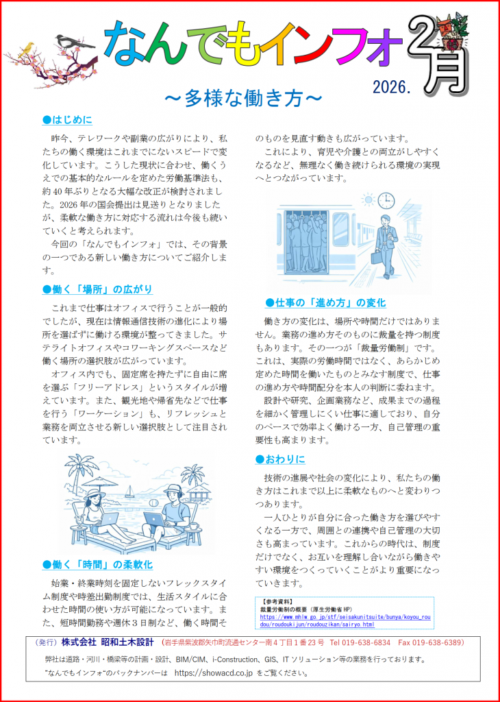 昨今、テレワークや副業の広がりにより、私たちの働く環境はこれまでにないスピードで変化しています。こうした現状に合わせ、働くうえでの基本的なルールを定めた労働基準法も、約 40年ぶりとなる大幅な改正が検討されました。2026年の国会提出は見送りとなりましたが、柔軟な働き方に対応する流れは今後も続いていくと考えられます。今回の「なんでもインフォ」では、その背景の一つである新しい働き方についてご紹介します。